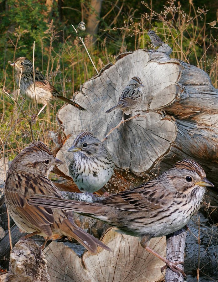 Fairly common in W, scarcer to E. Breeds in wet thickets, but found in drier habitat, usually with grass, bushes and brush, the rest of the year. Secretive, tending to creep around in cover or fly off to hide. Song: a series of full-bodied musical trills, the longest in the middle. Call is an emphatic 'chip.' ID: Superficially like SOSP, but smaller and slighter. Rather cute with a peaked crown, small bill, and distinct eyering. A bird of fine streaks, on crown, nape and, most importantly, breast; actually just about everywhere if you look closely. Breast has subtle but distinct buff wash across it. Like SOSP and SASP, it has a dark central breast spot. Briefly held juv plumage more similar to SOSP; focus on size and shape.