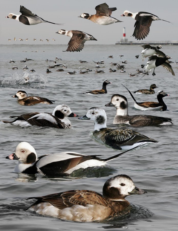 Common on the ocean, bays and river mouths of the N. Usually in small, widely spread flocks of its own kind. Formerly called Oldsquaw. Very vocal with beautiful yodeling call. Shape, behavior, and color all contribute to its very dainty but elegant appearance. Complex molt patterns with several color patterns. Makes a big splash in water when landing. ID: Smallish with thick neck but small head and bill. General impression is usually of a flock of very tastefully pale-colored dainty ducks, with a lot of variation, some with long tails. On wintering grounds, females appear mostly like juvs but are warmer brown on the upperparts and breast (grayish in young birds). Juvs are variable with males tending to have grayer scapulars. Young males become more obvious later in winter and summer as pink develops on the bill and new longer and whiter scapulars are molted. Adult males have long tails and subtle browns, grays, and whites that any decorator would be proud of. From late spring through fall migration both sexes take on a darker appearance. In flight form tight groups; look for all-dark wings with fast wingbeats on pale birds. Often rocks from side to side enhancing similarity to alcids.