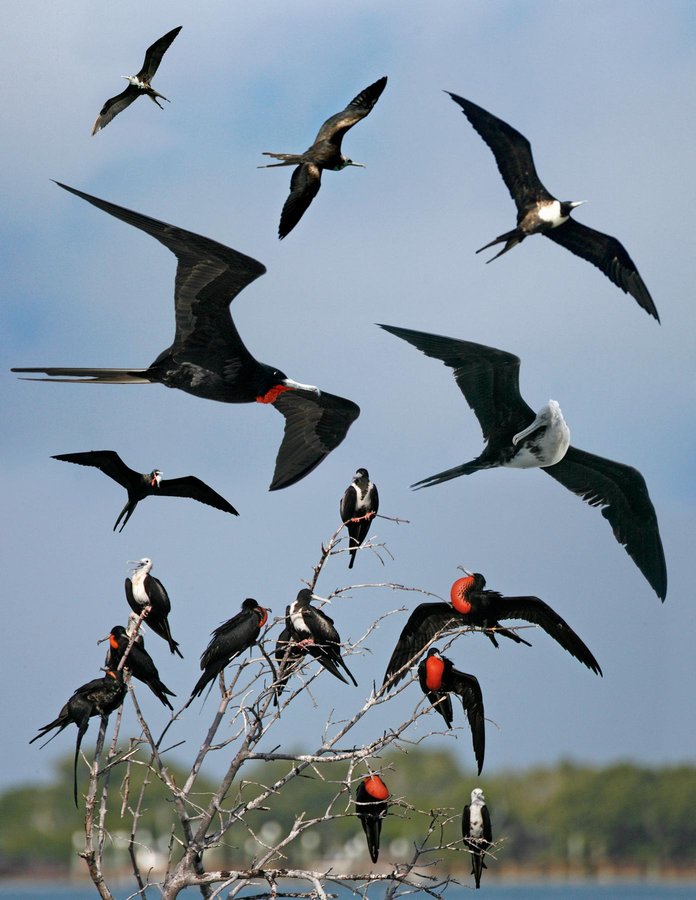 Uncommon and local breeder that often travels further afield. Often nests and roosts communally. A huge and prehistoric-looking aerial specialist that hangs in the sky with the ability to drift over large areas, apparently without effort. Catches fish and is piratic, stealing from others. ID: Long and slim with deeply forked tail and long, hooked bill. Deep wingbeats with wings that look too long relative to slight body. Adult male (5+ years): appears all black. Bright red throat sac (incredible in display), often difficult to see. Adult female and imms: all have white on breast with variable shape (see plates). Other frigatebirds have been recorded -study size, shape and extent of white on underparts and presence of covert patch on upperwing in adult males.