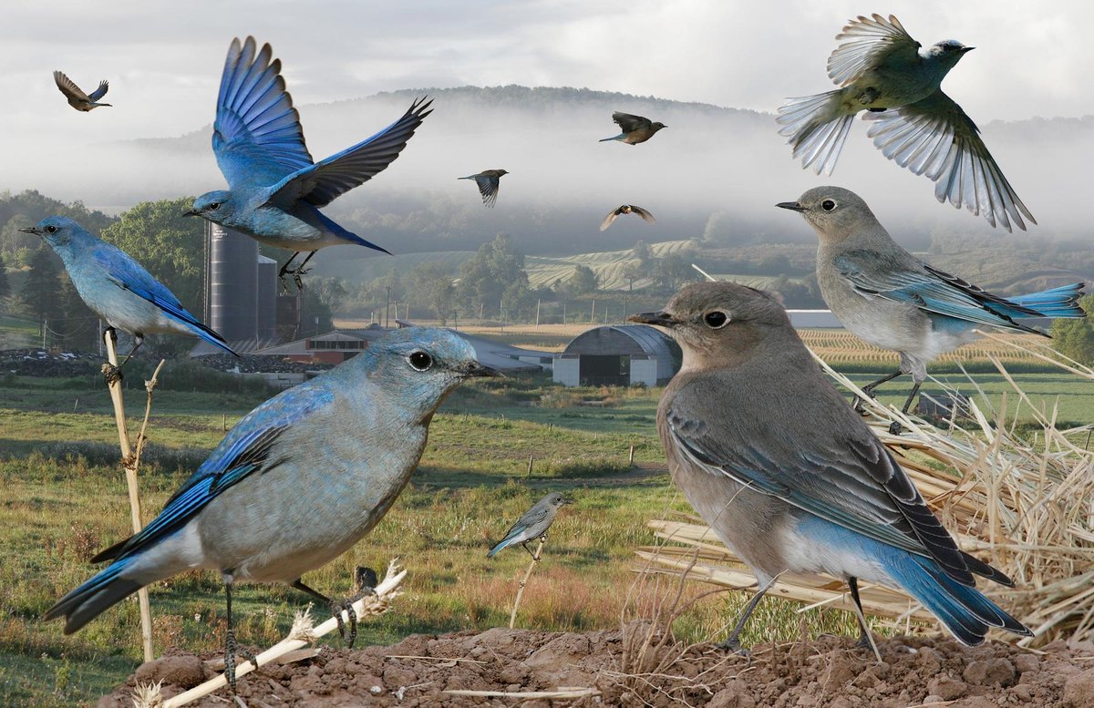 A bird of open prairies and farmland. Regular stray to E in late fall. Often hovers over fields, otherwise behavior similar to EABL. Noticeably longer and slimmer than EABL with smaller head, longer, more strongly notched tail. Longer-winged with long primary projection. ♂: beautiful sky blue. ♀/1st-w: much duller (fall birds often buff-chested), palest on belly, darker flanks with contrastingly pale blue wings and tail. Tail has dark tip. Ist-w: aged by retained juv coverts.