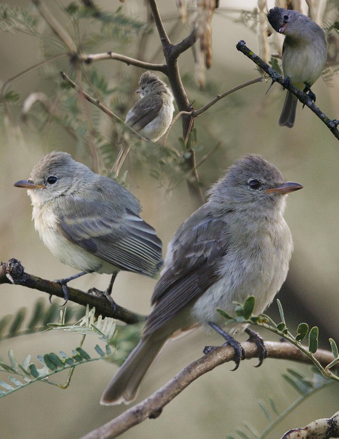 Uncommon in Rio Grande Valley, usually in mesquite woods. A flycatcher that appears more like WAVI. Often sits upright. Bland with short, thick bill, bushy crest, indistinct supercilium on otherwise plain grayish face. Most often heard, a ringing ‘peer’ gives its presence away. Often in mixed flocks.