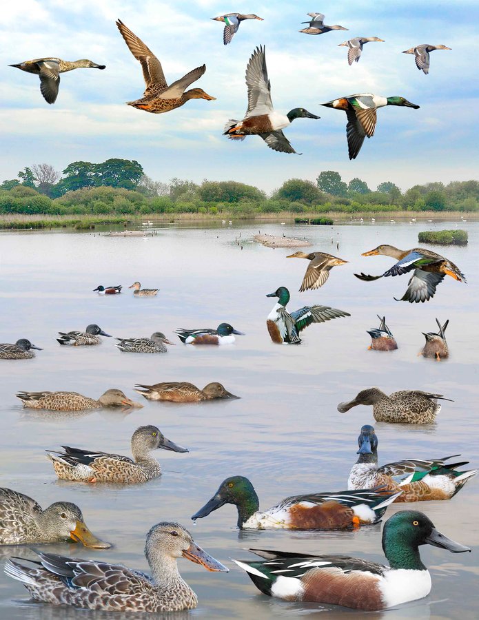 Fairly common in a variety of shallow wetlands. Often found in water treatment plants. Usually in small loose groups but can be in larger numbers in suitable habitat. Sometimes feeds in tight packs that move in circles. Bill often swished from side to side as it sieves out food. ID: A large heavy duck, with stonking spatulate bill, that sits low in the water. The bill, combined with short neck and broad head, add to its distinctive bulkiness and should be enough to id most birds. Males unmistakable: bright white accentuates green head and chestnut flanks. Depending on light, head can look purple or black. Females often look pale due to broad fringes to feathers. Bill variably orange with bright edges. Eclipse and young males variable with multiple spots and arrows on breast/flanks with a range of chestnut, white, and green. Ageing males is complicated. Partial face crescent and upperwing pattern similar to BWTE — but always concentrate on size and shape!