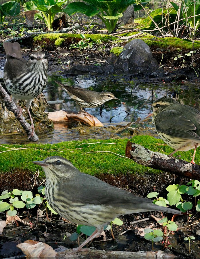 Common breeder along streams and in wet wooded areas. On migration, also found in drier areas with leaf litter but still mostly on the ground. A ground-dweller that walks purposefully on long legs, always bobbing its tail in rhythm. Stops to toss leaves over or pick at food. Song a series of accelerating notes falling in pitch at end. Call a ‘chink.’ ID: A large warbler with a small head, broad tail, and heavily streaked underparts. Streaks usually blend into each other forming rows on a usually buff background. However, some are white and far more visually striking. The striking supercilium is usually the same color as the breast, very long, and straight or downcurved behind the eye. It stays the same thickness or narrows behind the eye. Upperparts uniform dark brown. 1st-w has rusty fringes to tertials. In flight, waterthrushes have noticeably dark underwings.