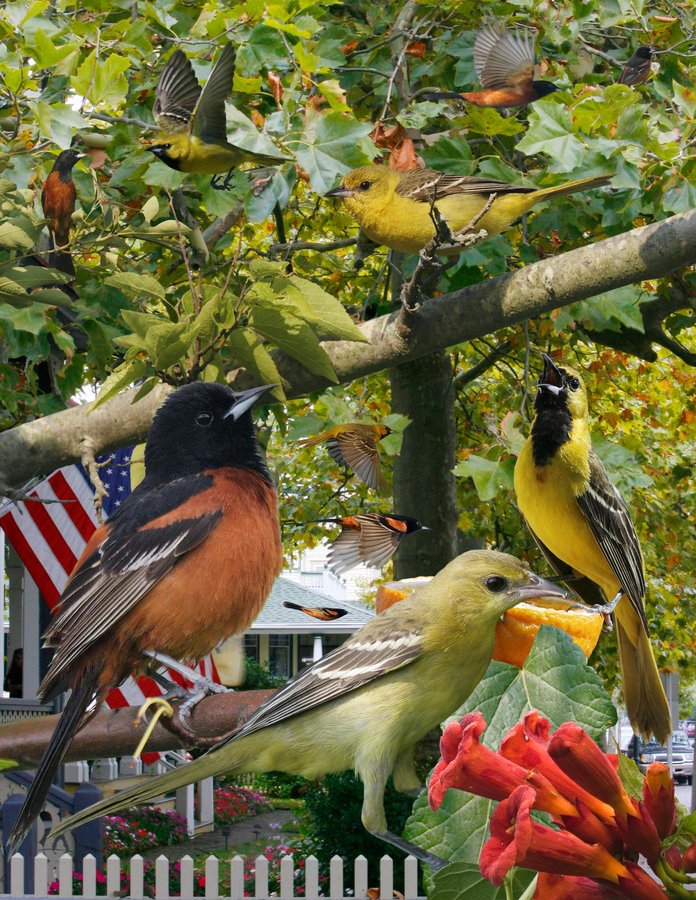 A common bird in suburbs, villages, and areas with scattered trees bordering overgrown fields. In W, also found in riparian woodlands. Occurs out of range. Sometimes sneaks into gardens feeding low among flowers and fruiting trees. One of the first migrants in both spring and fall (Jul). Chattering call gives away presence. Pleasing song: a warbled array of sweet musical notes. ID: Distinctively small and slender. Narrow-tailed with a small head that appears pointed. Head sometimes seems rounded and bird has a gentle expression. Small-billed compared to other orioles. Ad ♂: unmistakable chestnut and black. Ad ♀: yellow and green tones always lack orange of BAOR. Back gray-green, duller than head. Wing bars always narrow and well-defined. 1st-w: as ad ♀. 1st-s ♂: black throat. Sings a lot and therefore frequently seen.