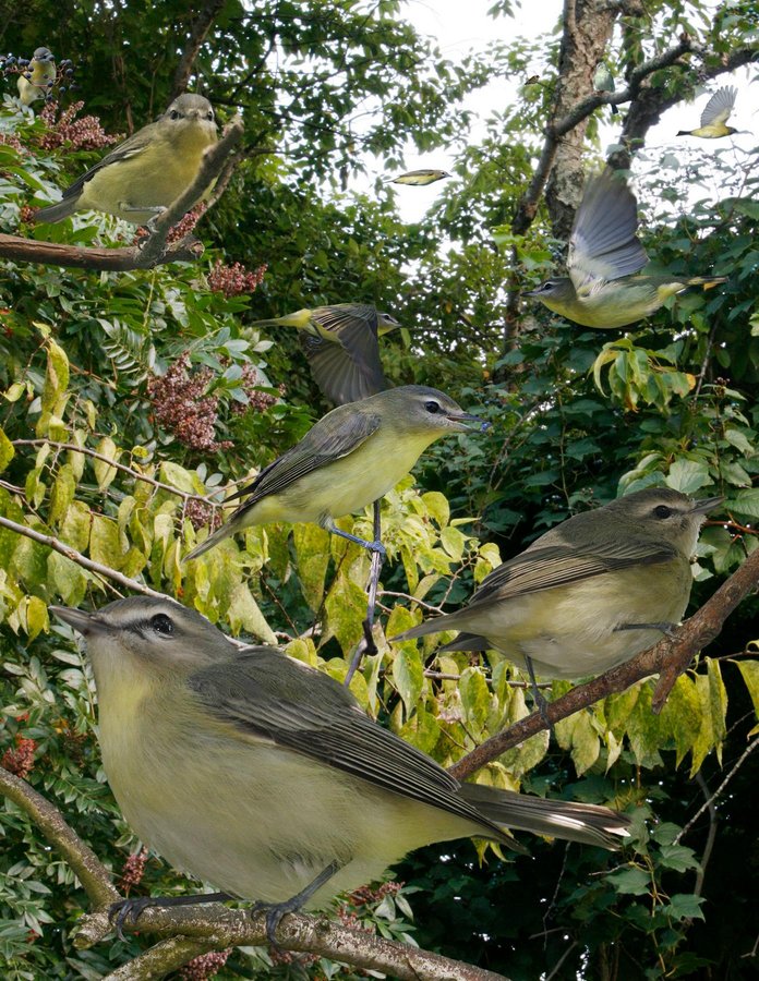 Uncommon vireo in open deciduous woodland, favoring willows and alders. On migration, usually found in mixed flocks. Small size, soft expression, and fairly small bill can make it look warbler-like (see TEWA). Song easy to pass off as REVI but slightly sweeter. ID: Small with average proportions and evenly-domed head. In spring, tends to be duller with yellow strongest on central breast. In fall, upperparts greener and underparts more uniformly brighter yellow, though never brighter on breast sides than center. Dark primary coverts contrast with paler greater coverts. Dark eyeline extends to base of small bill.