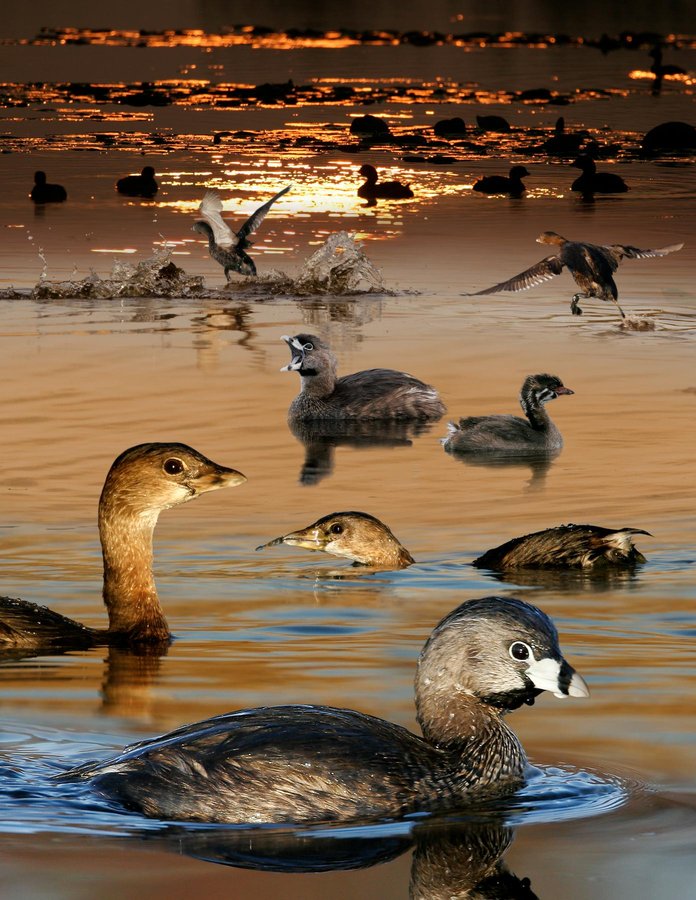 Widespread and fairly common but usually in singles or pairs. Found wherever there is water and adequate food. Prefers area with vegetation but can be found anywhere in winter. Although the commonest grebe in many areas, can be illusive and easily overlooked due to size and behavior. When approached tends to submerge quietly, like a submarine, rather than fly. ID: A small compact grebe with broad, short, pointed bill. Brown overall appearance, slightly darker on back as year progresses. Breeding birds develop black ring on bill (bill and ring larger in males), dark on crown, and have striking black bib. Juv has striped head, a few keep pattern through winter but most molt and appear as nonbr after several weeks. Rarely flies. More often seen running across water with wings flapping. No wing bars. Vocal.
