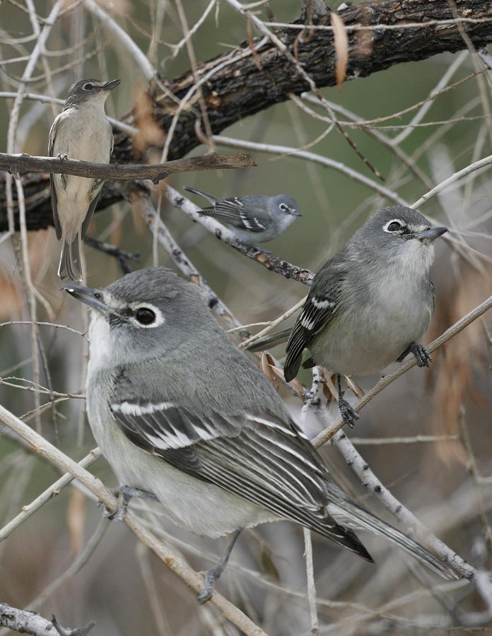 Very rare in W. Formerly conspecific with BHVI. From that species by gray color, lacking green tones except occasionally on flanks and rump. White fringes to flight feathers. Song and call slower, like YTVI.