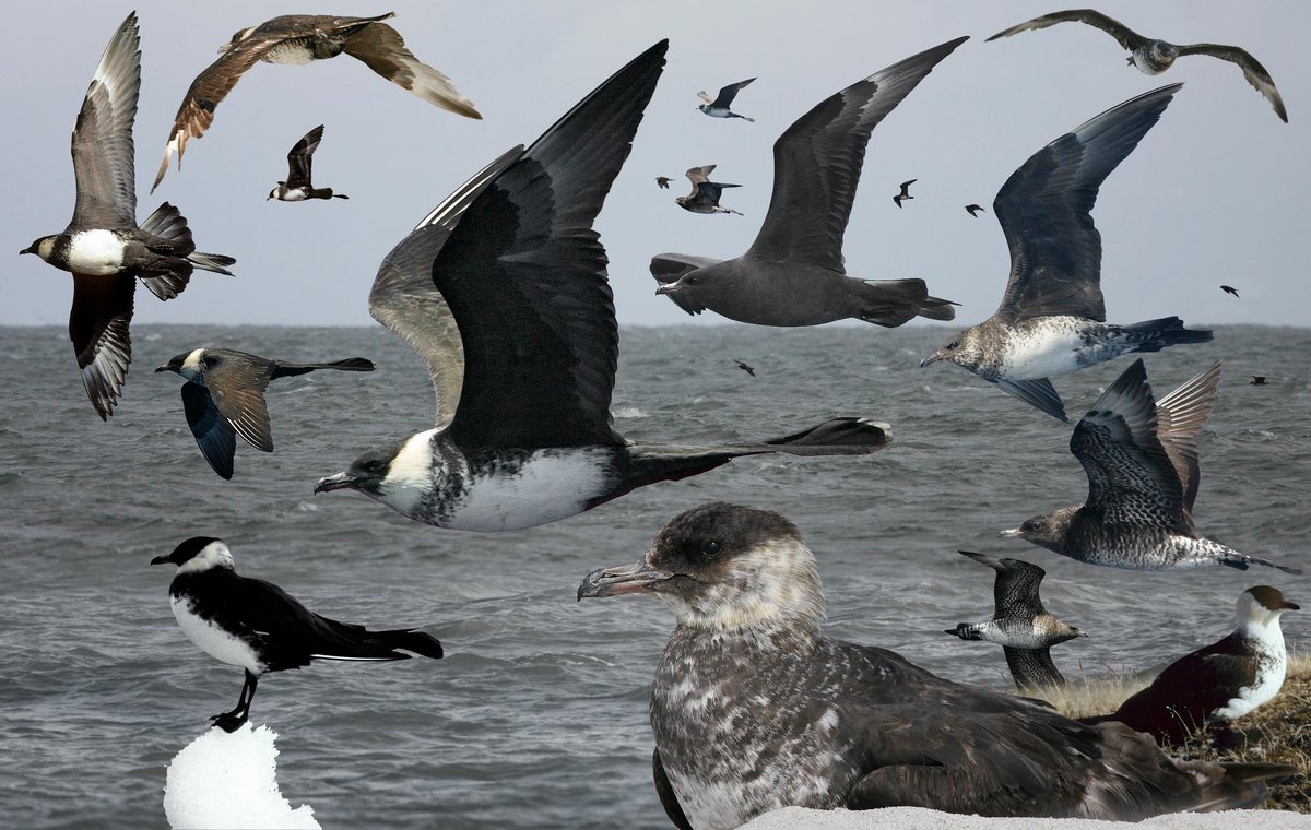 High-Arctic breeder. Rarely seen from land, but fairly common offshore. The most likely winter jaeger. ‘Poms’ often seen migrating in packs. ID: Largest and most powerful jaeger; a real bruiser. Size and shape best ID feature. Bigger with flattish undercarriage, bulging sternum, similar to LTJE (this is an underestimated ID challenge: PAJE heavier in the belly). Long thick bill. Large white wing flashes. Also second diagnostic pale flash formed by pale bases to greater coverts on underwing. Ad pale morph: long central tail feathers (‘spoons’) usually present on breeding and migrating birds but may be broken off. Yellow face with dark cap extending onto malar region giving ‘mean’ look. Breast band often broad, narrower in males. In winter shows barring on underparts and rump (aged by uniformly dark underwing). Central tail feathers shortened but broad and blunt-tipped. 2nd-year: similar but some barring on underwing. Dark morph (approx 10% of population): dark brown, cap darker but still with wing flashes. Juv: variable but typically uniform dark brown with pale-tipped upperparts. Central tail feathers very short and blunt-tipped. Juvs migrate after mid-Oct.