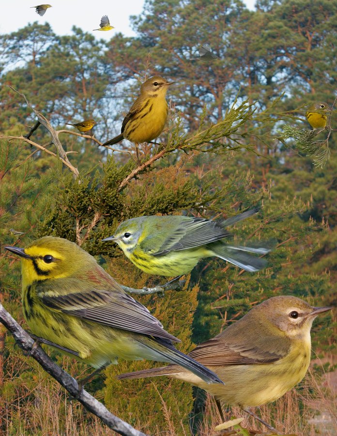 Fairly common in field edges, brushy areas, and mangroves. Often at head height, it feeds lower than many other warblers but not on the ground. One of 3 species (KIWA, PAWA) that always pumps tail, revealing its white outer tail feathers. Often the only warbler left singing in the midday sun — buzzy ‘zee’ notes steadily rising in pitch. Moves deliberately as though making sure it has enough time to pump tail. ID: A lightweight warbler with a slim feel due in large part to its long tail. Smooth lines, domed head, and pot belly. Focus on distinctive face pattern: pale line above eye and arc below it. All have yellow underparts with streaked flanks, uniform upperparts with weak wing bars. Ad ♂ br: boldly marked with rufous on back. In fall, colors subdued and rufous often difficult to see. Ad ♀/ 1st-yr ♂: duller version of ♂. 1st-yr ♀: browner upperparts, paler yellow underparts with weak streaks.