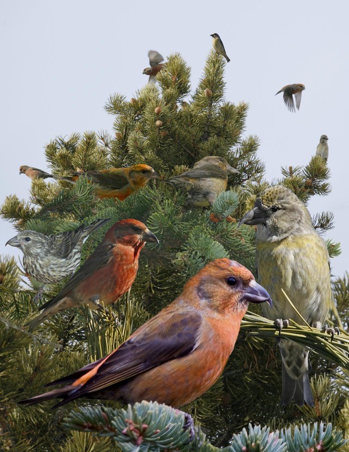 Uncommon and exclusive to evergreen forest with pine cones; has crossed bill for prying out seeds. Moves to other areas when food is scarce. Able to breed throughout the year if food supplies are good. Often feeds quietly in small flocks, hanging from any angle parrot-like. Easiest to see flying overhead giving HOFI-like chip notes. In winter, will sometimes come down to salted roads. In N Am, there are 10 ‘types’ (6 in E), all probably full species, averaging different bill sizes and shapes. Most calls are separable using sonograms. Types will often mix and field ID is still evolving. ID: Crossed bill is diagnostic except for confusable WWCR. Chunky with oversized head and short forked tail. All have dark wings and tail. Ear coverts subtly dark. Some show weak wing bars. Ad ♂: uniform dark red on underparts, head, and back. Undertail coverts white with dark centers. Ad ♀: mostly olive green but variable and can show yellow, orange, or red. 1st-yr ♂: patchy green and red. Juv: heavily streaked underparts.