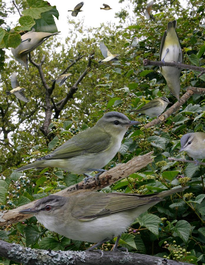 Very common. Found just about anywhere with deciduous trees. On migration, often joins, mixed flocks, and can be commonest bird. Although has typical slow vireo-like movements, it can often move quickly between trees. When disturbed, often the first bird to come close, eyes looking right at you with head pushed forward. Calls frequently, an agitated slurred ‘weeer’ (somewhat VEER-like) that is sure to bring other birds closer. Song a series of short hurried undulating phrases continuing for a long time: ‘wereup weredown,’ ‘werin wereout.’ ID: Flat-crowned, large-billed with a strong facial pattern that gives mean look. Black eyeline and lateral crown stripe bordering bold supercilium make distinctive in most of range. Crown grayish on otherwise uniform olive upperparts that lack even a hint of a wing bar. From below, short-tailed with a yellow vent — this rules out most other vireos even with poor views. Underparts appear off-white though yellow wash on flanks is sometimes obvious. Red eye in adults, dark in otherwise similar juv. Pointed head obvious in flight.