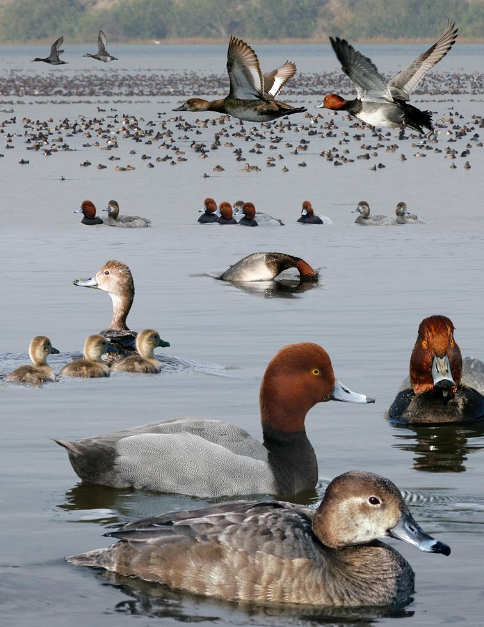 Locally fairly common diving duck, sometimes in big winter flocks on rivers, deeper water inland, and coastal lagoons. Over 75% of N American Redheads winter at Laguna Madre in s. TX. Large flocks also in Great Lakes area but there are large areas of US with only a few. Often with other diving ducks. Breeds in a variety of wetlands. ID: Fairly large with big-headed look, steep forehead and thick neck on a body that sits high in the water. Shape is strikingly different from CANV, closer to some other diving ducks, but still the key ID feature when not sure. Males are distinctive. Females are often confused with LESC and RNDU — focus on head shape and pattern. Females (similar) are most similar to RNDU but Redheads are much paler brown. Scaup lack pale line behind eye and are darker. Adult and imm males (similar) are often compared to CANV because of their chestnut-and-black head and neck. There the similarity ends. If it’s not pale, it’s not a CANV. Distinctive shape and overall paleness also striking in flight — sometimes the upperwing bar doesn’t stand out.