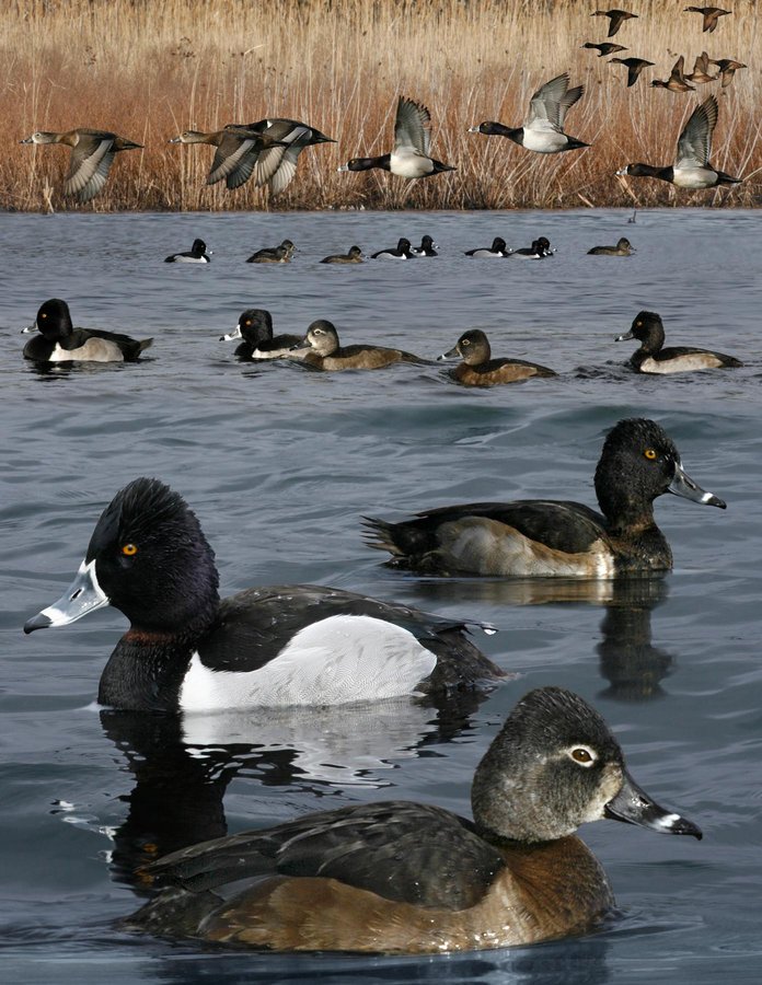 Fairly common. Usually in small groups, sometimes with other diving ducks. Found in a variety of freshwater wetland areas but often in ponds surrounded by trees where it is the only species. Maroon ‘ring-neck’ on males hard to see and not a good field mark. ID: A variable-looking duck that often gets people scratching their heads. Always focus on the distinctive sloping forehead and peaked rear crown but beware of ‘flattened-out’ wet diving birds. Perhaps ‘ring-billed duck’ would be a better name as all birds have white ring emphasized by black bill tip. Adult males appear black-and-gray with a diagnostic white patch at the front of the flanks that’s easy to see at distance. Iridescent blue-purple head usually appears black. Imm and eclipse males have a ghost pattern of freshly plumaged males but look ‘grungy’ with brown mixed in flanks and with duller bill. Females have darker backs and caps than similar species and a more contrasting overall appearance. Distinctive ‘spectacles’ around eye. Color is variable; gray-and-brown can often be best term to describe them. In flight have broad uniform gray wing bar, but also look for the distinctly patterned males in the flock.