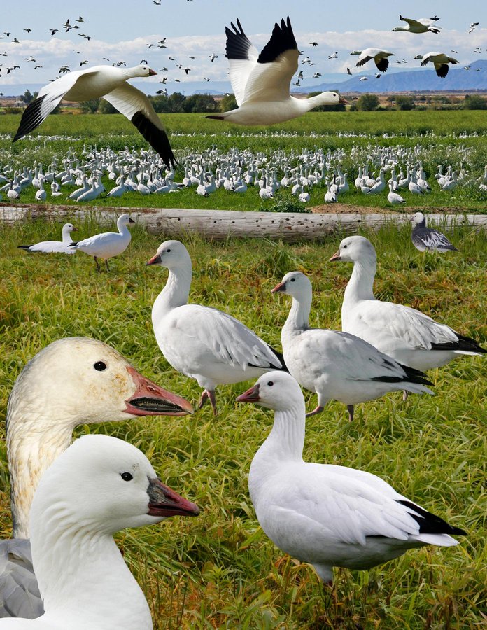 Breeds on wet tundra. Locally uncommon. Rare but regular, mostly in SNGO flocks (1:1000). ID: Much smaller with proportionally shorter legs and neck than SNGO. Cute look with round head, stubby short triangular bill has straighter border with face. Gray area (wart) at base of pink bill. Sexes similar. Juv as adult except for brown-gray tertials and secondary coverts (often wear white by late winter), duller bare parts and gray wash to crown and rear neck. Often difficult to age by late winter. Blue morph is extremely rare; more contrasting than blue-morph SNGO with white face and belly and almost black darker parts.