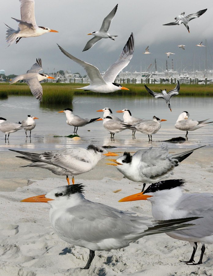 Common in coastal areas on ocean beaches, tidal flats, and roost areas close to fishing grounds. Colonial nester on sand bars. Noisy: loud piercing ‘keerak’ can be heard at great distances. Tends to be the highest flier in feeding flocks. ID: Size, shape and bill usually make ID straightforward. Apart from CATE, always the largest in the flock. Large and sturdy, remaining graceful and attenuated. Lollipop-orange bill always noticeable. Pale gray upperparts with narrow trailing edge to outer primaries in flight. Adult: solid black cap and bill often red-orange in spring (can be confused with CATE). Nonbr: head mostly white with black line /crest. Juv: variable. Legs initially orange turning to black with yellow bill turning orange. Bill sometimes noticeably shorter than in adults. Strong contrast in upperparts. 1st-s: as ad br.