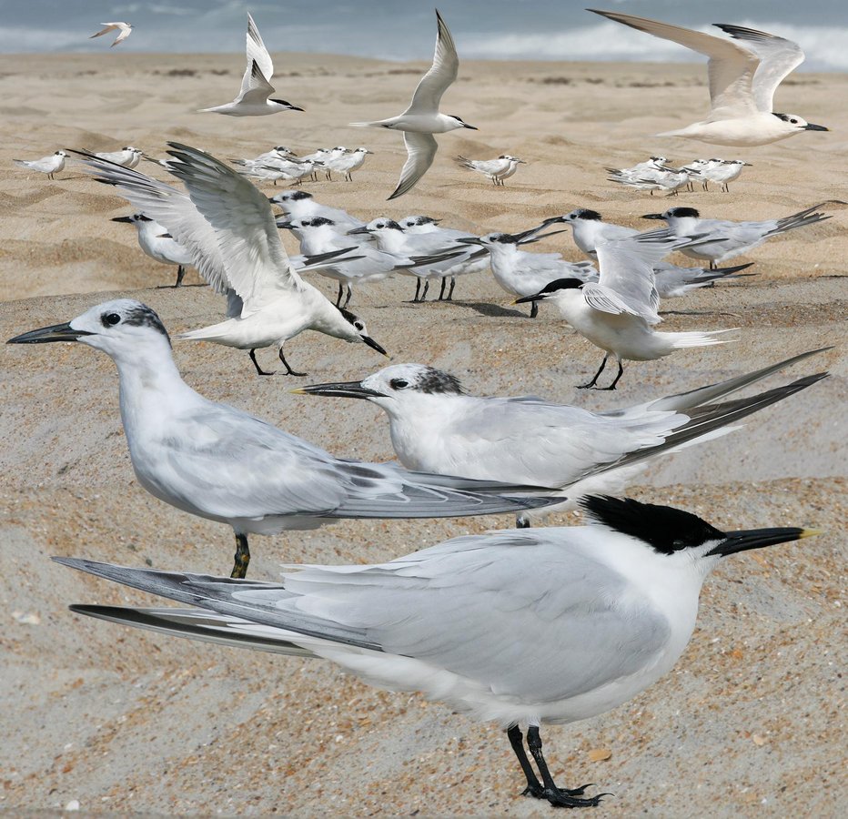 Fairly common in more s. coastal areas. Tends to congregate with ROTE and other larger terns, rather than smaller cousins. ID: Very pale upperparts, only ROTE paler. Two-tone black-and-white all year with the exception of yellow bill tip (not juv). Very slim, particularly in flight, with long, angled wings. Noisy, sounding like a weak high-pitched ROTE, ‘kareek.’ Ad br: crested black cap. Nonbr: reduced cap. Primaries wear darker. 1st-s: as nonbr. Juv: black subterminal markings to upperparts. Flecked dark cap. Bill usually with yellow or orange, becoming black in a few weeks. Yellow tip by spring. Age by dark in tertials through winter. Cayenne Tern, a South American ssp, has been recorded a few times. Bill color is variable from yellow-orange to almost black.