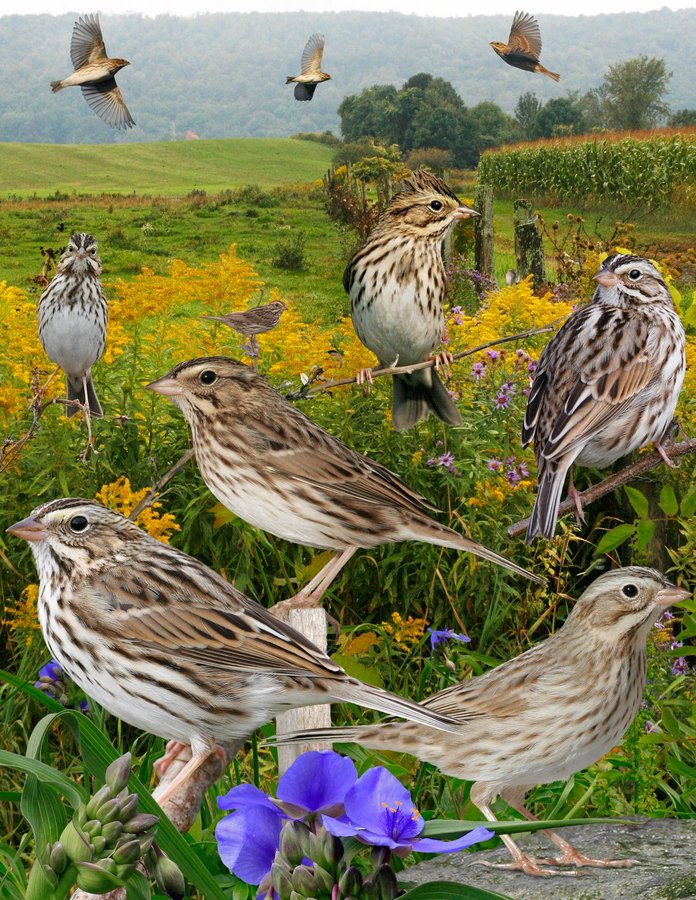 Very common in grassy areas year-round. Usually on the ground, but perches on small bushes and posts. Sometimes found in small loose groups. In flight, listen for a thin ‘tsip’ call. Song: accelerating chips leading to a buzz: ‘seee yer.’ ID: Much variation in color and streaking, so really learn its distinctive size and shape. Small, chunky and neckless with a short, narrow, forked tail. Head often slightly crested. Always a crisply marked bird. Underparts are streaked on breast and flanks contrasting with white belly. Streaks vary from black to brown and are usually buff-fringed on the flanks. Malar region is strongly patterned. Upperparts are neat with a striped appearance, sometimes with pale lines down the back. They vary from gray to brown but always have broad rufous fringes to greater coverts. Supercilium is often yellow at the front. Many races. ‘Ipswich Sparrow,’ nests on Sable Is, NS, winters down E Coast in sand dunes, and is very distinctive: large and pale, with blurry brown streaks, and easy to overlook as SOSP.