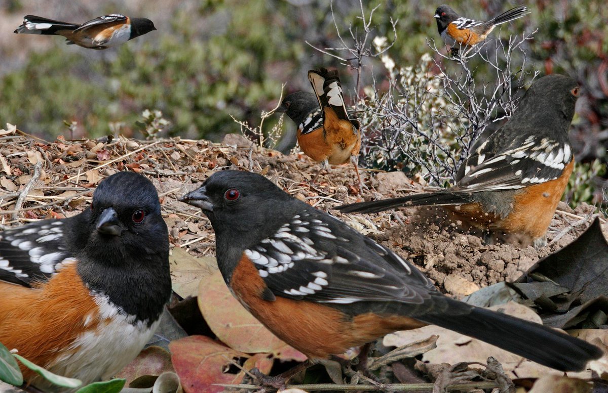 Uncommon in W. Very rare winter visiter to E. Formerly conspecific with EATO. Very similar and sometimes hybridizes. Most striking difference from EATO is heavily spotted and streaked upperparts, boldest on the wings. However, SPTO does not have a white patch at base of primaries. ♀: darker and grayer. As towhees are often heard before seen, listen for harsher and buzzier call, ‘zareeee.’ Hybrids show intermediate characters.