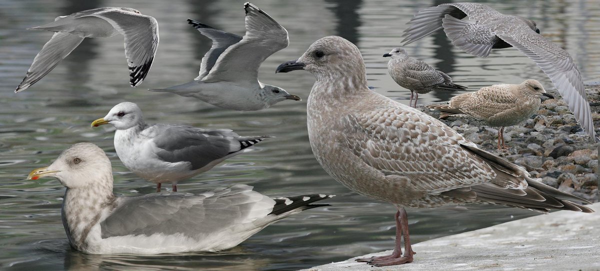 Breeds n. Canada. Scarce in winter to s. ID: 4-year gull. Size and shape as largest ICGU's. Id from the latter with great caution and as follows: adult often has hooded appearance (nonbr), most (80%) have dark iris, extensive black wing-tips (with white 'tongues'), slightly darker back. Juv: darker brown, dark-centered tertials and primaries contrast with rest of bird, solid tail band. From HEGU by size and shape, bill size/color, dark iris, wing-tip pattern (whitish underwing usually most striking).