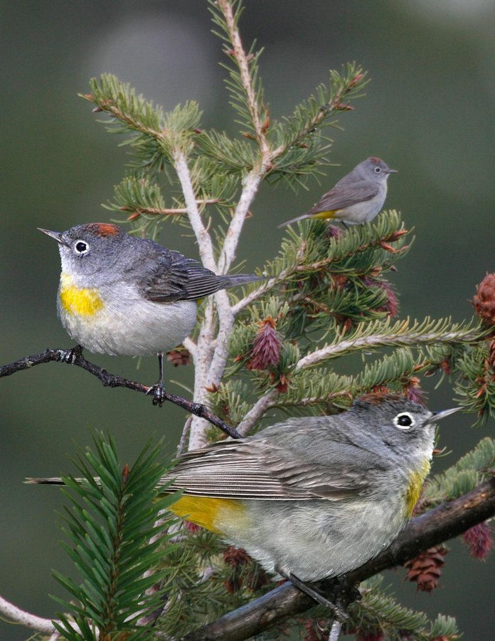 Very rare. Similar to NAWA but smaller-headed and longer-tailed with exaggerated tail pumping. Pale gray with bold eyering and yellow patches on breast and undertail coverts. Rufous crown patch and yellow reduced or lacking on ?/imm. Prefers scrubby vegetation.