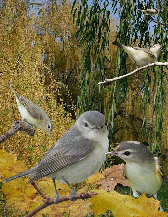 Fairly common in deciduous woods, particularly willows near water. Stays high, singing a lot — a fast and musical warble with scratchy tones but unlike a vireo in many ways. On migration, often joins mixed flocks. ID: Variable in coloration. Usually pale gray but some bright yellow. Open-faced and dark-eyed look with a hint of an eyeline just in front and behind eye. Supercilium is often broadest just behind eye. Pale base to bill enhances bland expression. Sometimes confused with PHVI but WAVI has different facial pattern with pale lores, longer bill and tail (usually held looser), lacks contrast between primary and greater coverts, yellow brightest on breast sides, usually much paler appearance and very different song.