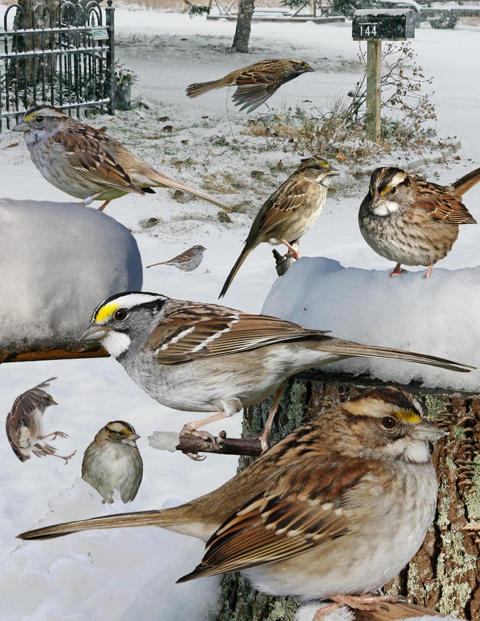 Breeds in mixed forest and bogs. Common winter visitor to parks, gardens, and woodland edges with undergrowth. Like other Zonotrichia, can sing in winter, slow clear whistles: ‘so wee wee wee wee wee.’ Call a sharp ‘chink.’ Found in flocks, often at feeders. Feeds on the ground or low in the undergrowth, and quick to move to denser cover. ID: A heavy-bellied sparrow with a thick neck, domed crown, and fairly long tail. Upperparts appear mostly rufous with large black smudgy streaks but has a uniform rump. 2 wing bars. Underparts are always browner on the flanks, palest on belly and grayer across breast, often with smudgy streaks. The throat ranges from striking white to dingy buff and usually has a black border. Supercilium varies from dark tan to gleaming white, variably yellow above the lores. Color patterns are highly variable. Usually treated as 2 morphs; white-striped and tan-striped, however, better thought of as clinal with many intermediate. Further complicated by ♂ averaging brighter than ♀. Nonbr: duller, becoming brighter in spring. 1st-w: dull and similar to dull nonbr but usually with heavier streaking on underparts.