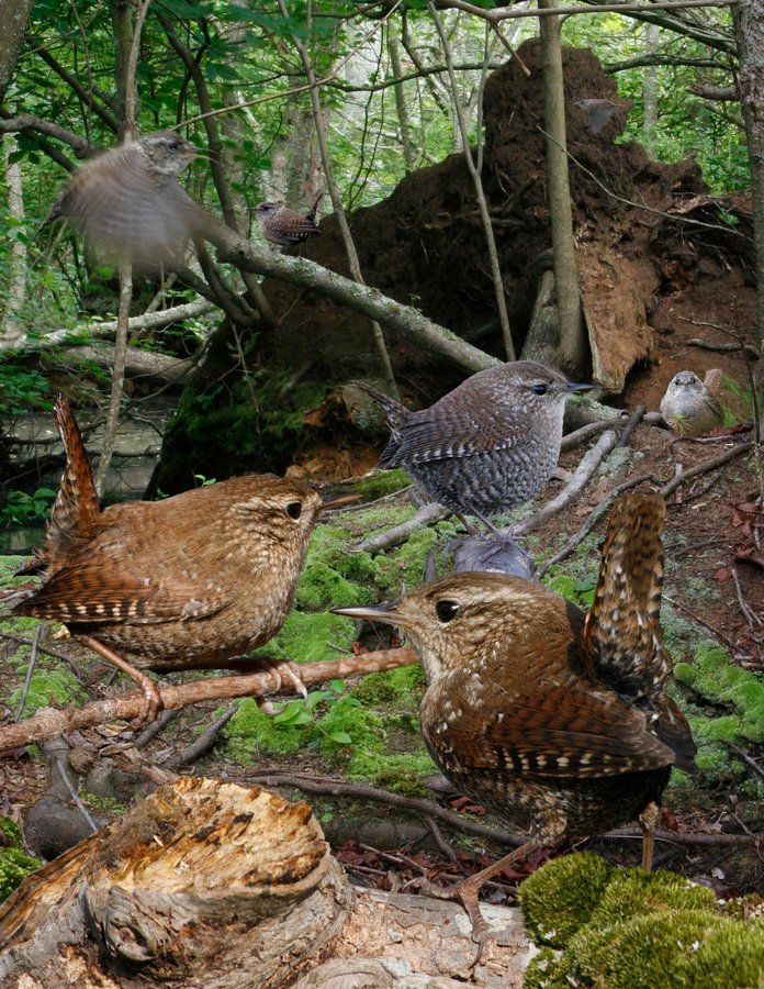 Fairly common in dense coniferous forest in summer. In winter, in wetter and boggier areas often with stumps and deep undergrowth. Often heard chipping and, in summer, an explosive warbled song that seems to go on too long, as if making up for bird’s tiny size. Can be very difficult to see, hugging the ground and staying in dense undergrowth — it blends in with background and is tiny. Views tend to be brief, as it’s always on the move. If you know the ‘chimp’ or ‘chimp chimp’ call note, you’ll hear many more birds than you see. ID: Tiny round ball of feathers with a cocked stub for a tail — nothing else like it! Variably colored: all shades of dark brown with a pale supercilium. Some more heavily barred than others (probably mostly juvs).