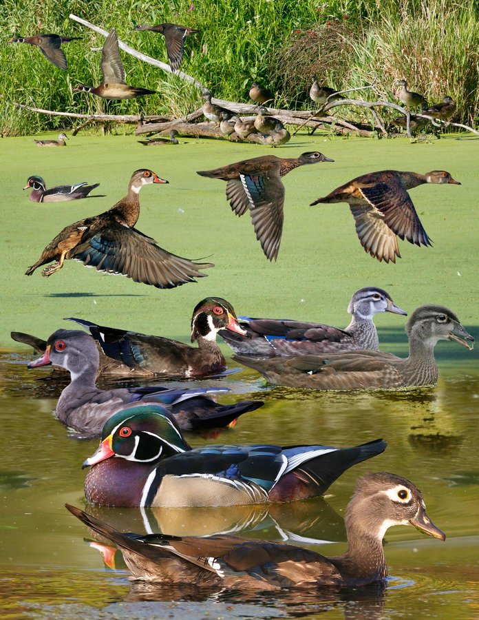 Fairly common duck but often hard to see. Lives in swampy woodland or any combination of water and trees. Tends to flush easily. Most often seen in flight (particularly at dawn and dusk) or heard giving squealy calls. Nests in cavities or nest boxes. Often perches on branches. Usually in small groups out of breeding season, but rarely with other species. Often kept in collections. ID: Fairly small duck with males having bushy crest creating bulbous back of head. Head patterns always distinctive. Long-tailed, a particularly useful feature in flight and makes bird identifiable in silhouette. Shape and patterns of color diagnostic. The male is stunning with an incredible head pattern! Eclipse male as female but retains distinctive eye and bill colors and ghost of head pattern. Its brighter colors are molted in through fall when it looks similar to imm male. Adult female neatly patterned brown and white with distinctive white tear around and behind eye. Juv shows dull neat pattern of adult female.