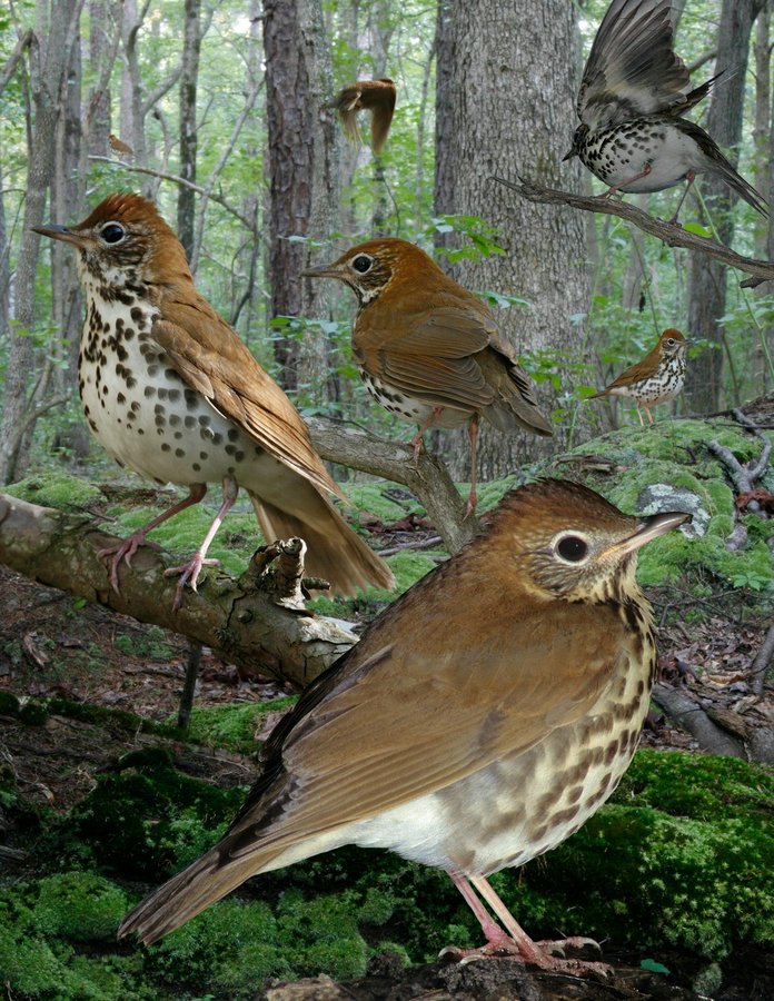 Common in mostly deciduous woodland and even densely wooded back yards. Easiest seen coming onto roads to feed though is always quick to fly off. Beautiful fluting song comprises a series of phrases and is always the pick of the dawn chorus. When disturbed, gives a series of angry machine-gunned notes. Flight call a dull flat buzzy ‘neep.’ ID: A really fat thrush with a short tail and big head. Larger than Catharus but not always obviously so. Its richer-colored upperparts, brightest on the nape, are usually noticeable. If in doubt, look for black-flecked ear coverts and a bold eyering. From the front, its large black spots on a white background always stand out.