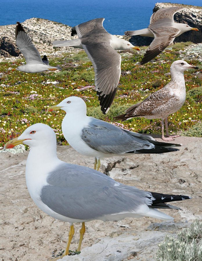 Very rare European visitor. ID: 4-yr gull. Formerly ssp of HEGU. Compared to this species older birds show slightly darker mantle, yellow legs, extensive black wing-tips, dark red orbital ring, and pale head (usually restricted to a few streaks around eye in winter). 1st-yr: intermediate in appearance between LBBG and GBBG. Hybrid HEGU x LBBG regular and very similar. Azorean race (not shown), has probably occurred. Dark hood in winter and darker back (older birds).
