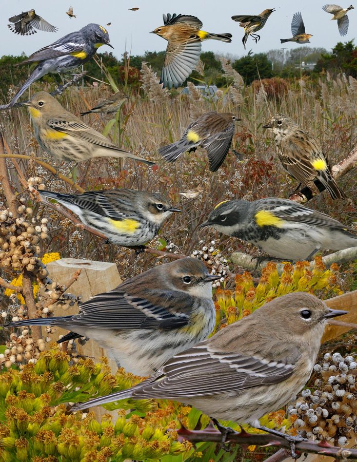 ‘Myrtle’ is a very common breeder in a variety of habitats: coniferous and mixed forest. W. race ‘Audubon’s’uncommon on w. edge, very rare in E. The only winter warbler in many areas. Arrives suddenly in Oct, after most other warblers have gone, often in many thousands. Loves bayberry bushes but is adaptable and tough, finding food on the ground or in treetops. Often flycatch for insects. Frequently in loose groups. Soft warbling song and calls a lot, a hard ‘chep.’ In flight, tail rounded at corners, slightly forked in center. ID: Large and solidly built with a fairly long tail. Always has bright yellow rump. Breeding plumages variable, nonbr similar. All have pale eyelids with a slight supercilium, narrow wing bars, streaking on breast (diffuse in winter), paler throat (white to buff) and yellow on flanks. Audubon’s is a browner bird with yellow or yellow-buff throat (often with white border). The head and ear coverts are one uniform color, emphasizing the bold eyelids and throat. More white tail spots. Different call, a softer ‘chep’.