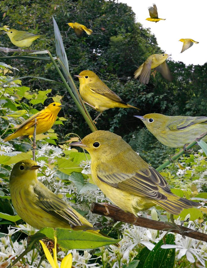 Very common in deciduous trees in open areas, woodland edges, and wet areas with willows. A solidly built warbler with average proportions and smooth contours. Its song ‘sweet sweet I’m so sweet,’ is the sound of summer. Loud call note. First to leave, some heading s. by early Jul. ID: Many shades of yellow with bold yellow edges to tail feathers, a giveaway even with briefest view. Also yellow fringes to dark-centered wing feathers on a generally uniform bird. Round eyering, black eye, and dark bill stand out on plain face. Ad ♂: bright yellow with red streaks in summer, mostly gone by fall. Ad ♀/1st-yr ♂: slightly paler than ad ♂ with hint of breast streaks. 1st-yr ♀: dull, some with few yellow tones. Always check tail pattern. Many ssp. The ‘Golden’ group, mostly in W Indies, occurs in FL Keys. ♂ has bolder streaking, some ♀/imms are grayer, particularly on head. ‘Mangrove,’ given full species status by some, breeds on S Padre Is,TX. Ad ♂ has chestnut head in summer.